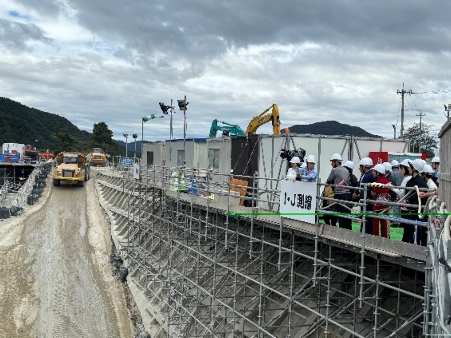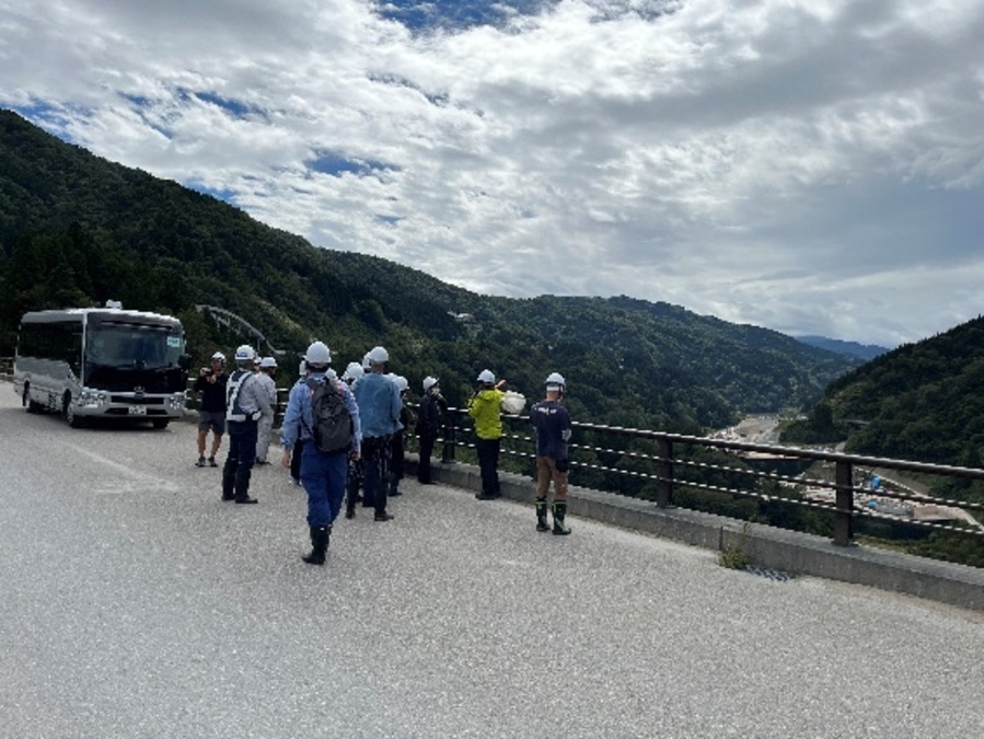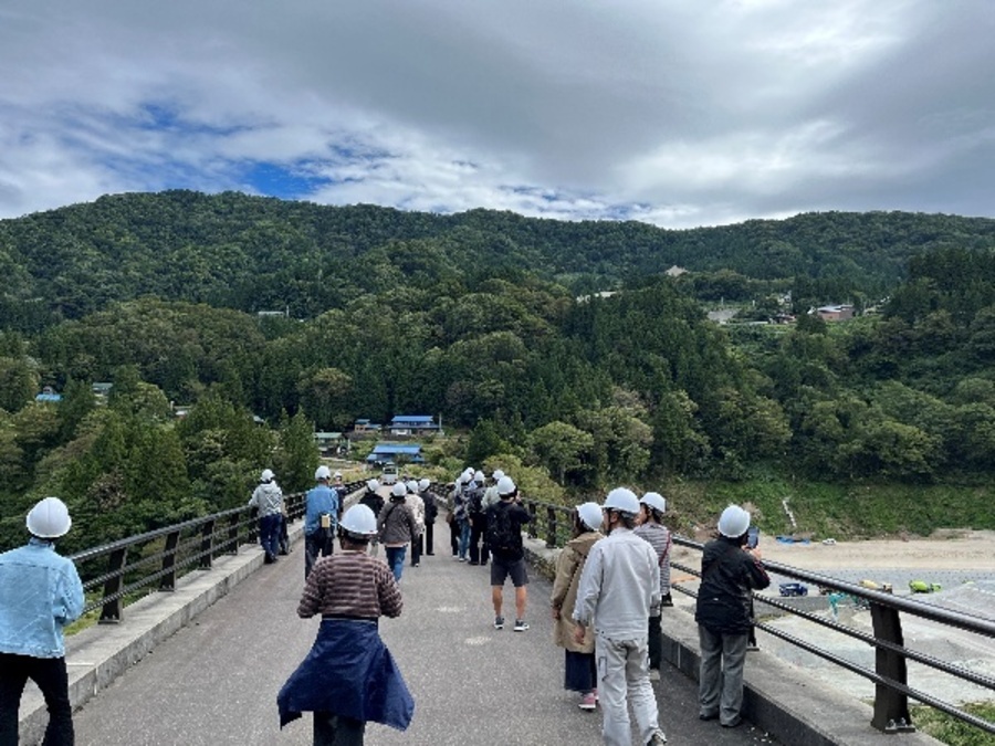 10月4日(土)利賀ダム連絡協議会主催による「利賀ダム見学会2025」が参加者68に名で開催されました。当初の天気予報では開催時刻には降水確率100%でしたが、晴れ男・女が大勢おられたのか、開会式と同時に雨が上がり、終了とともに降り出してきました。今回はダムサイト地盤変動域対策工事(旧ダム展望台)・利賀湖面橋では工事事務所職員から工事内容説明を受けながら実際の工事も見学できました。下島大橋では完成時常時水位位置などを確認しながら健康ウォーキングを楽しみました。平成27年に完成した下島大橋の橋台には当時の小中学生が描いた絵や作文などが保管されており、ダム完成時に開帳されるそうです。年々完成に向けて変化していく工事見学会を楽しみにしていると今回も好評でした