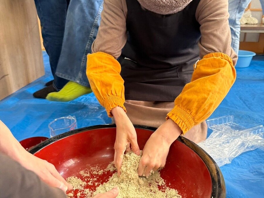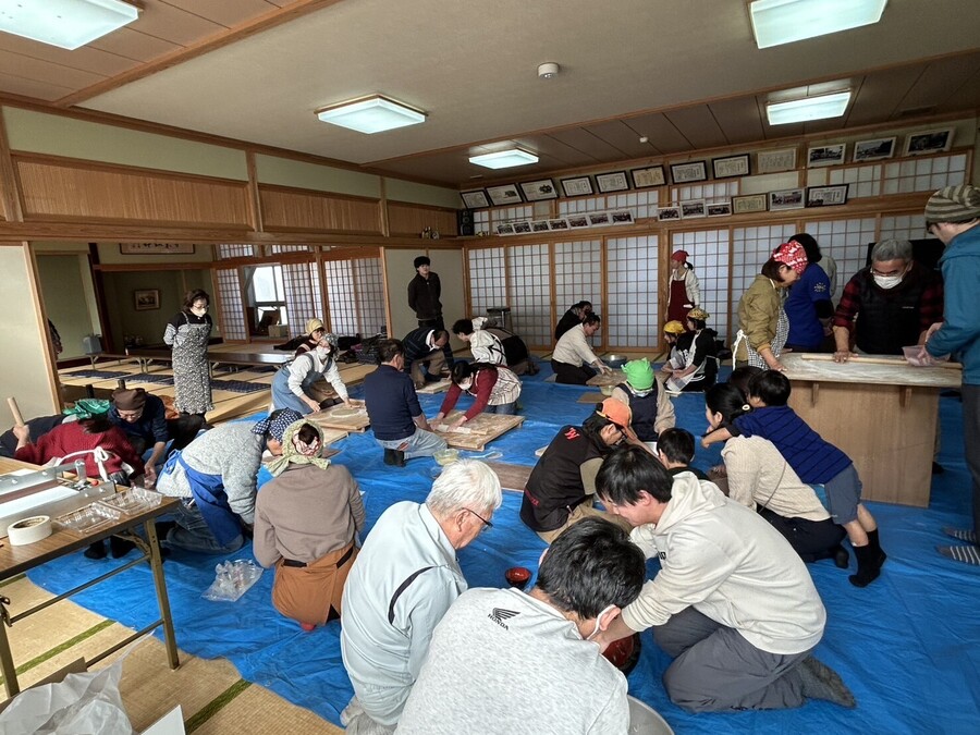 そば粉をこねるところから、のばし、切るまでをみんなで分担しながら、