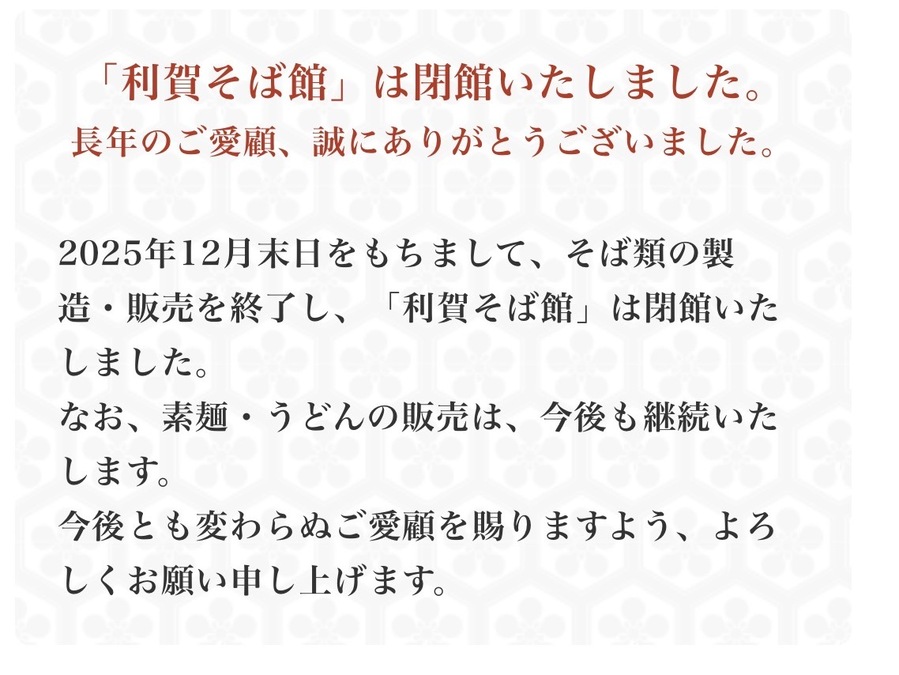 【利賀そば 製造・販売終了のお知らせ】